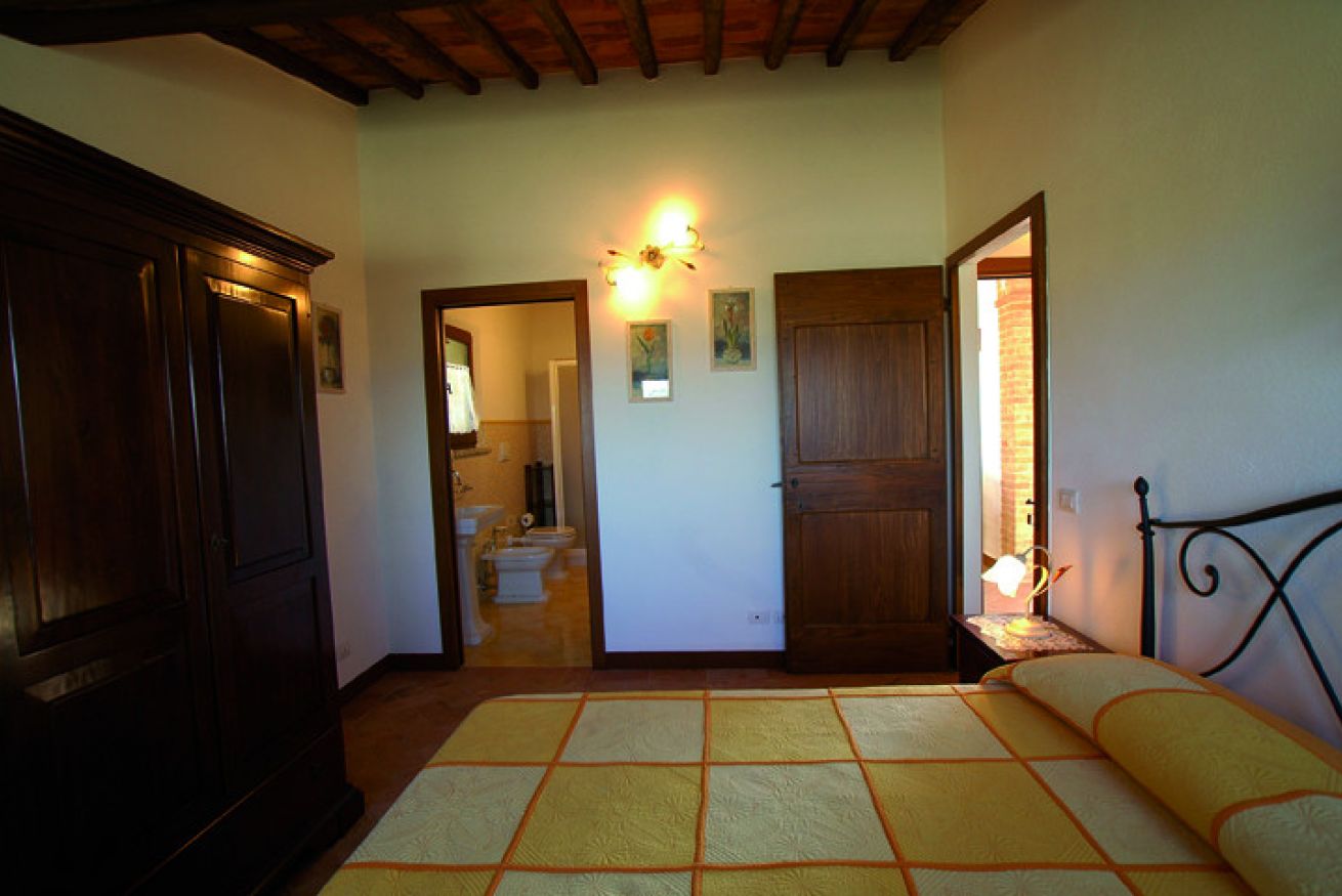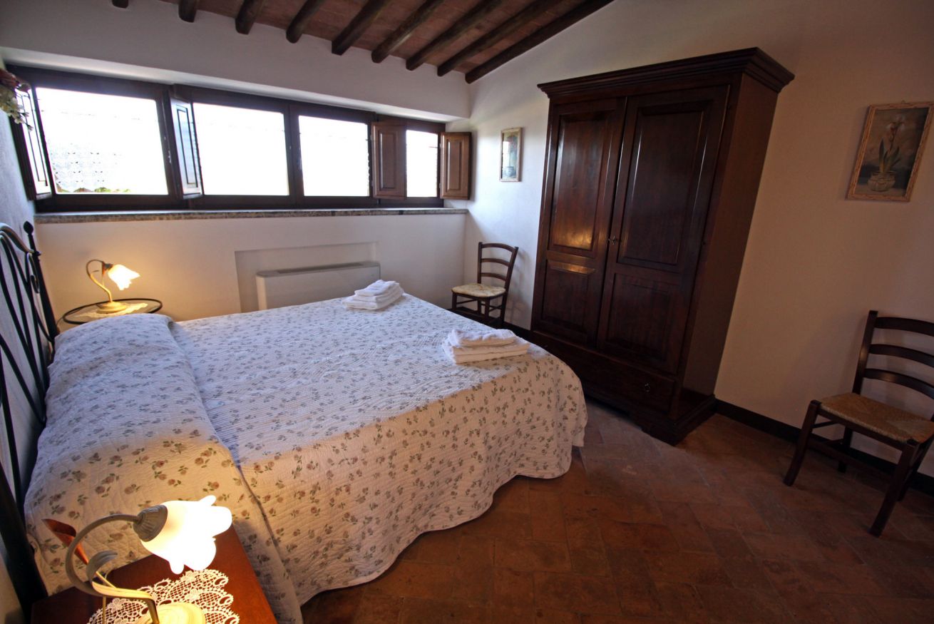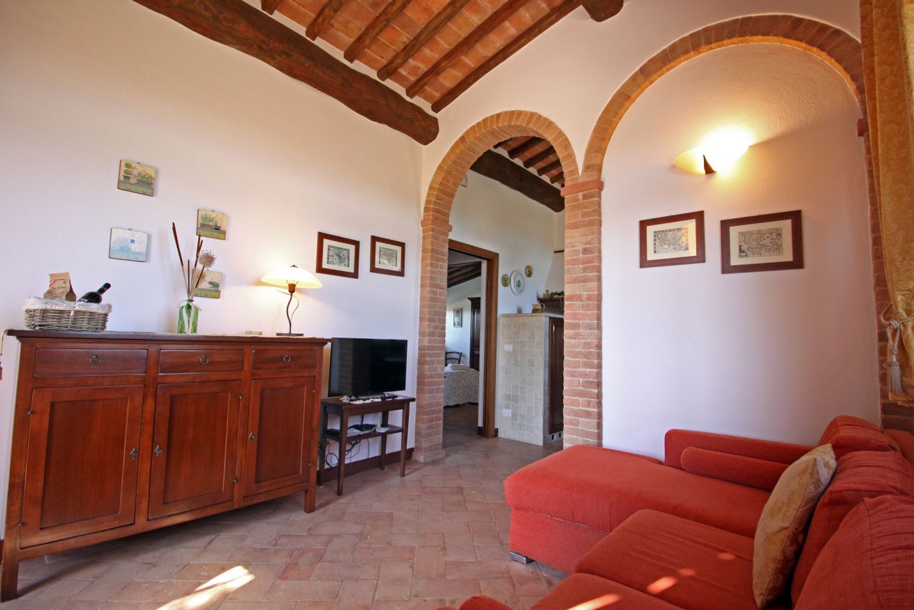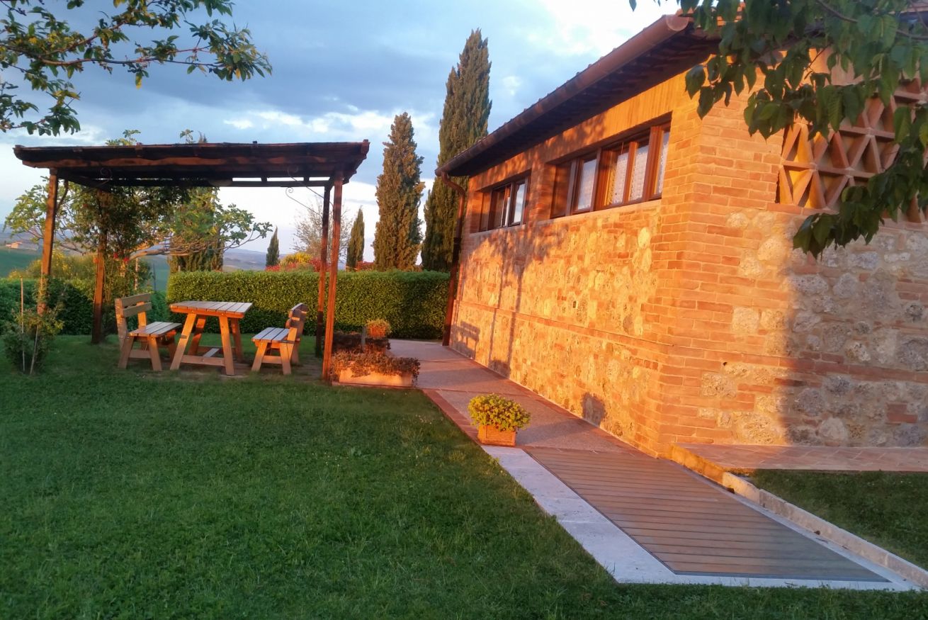 Capannina appartamento che si trova al pianoterra , al lato del podere ed è composto da un soggiorno con camino, una cucina con lavastoviglie, due camere una matrimoniale l'altra con due letti singoli e due bagni. All'esterno ha un giardino privato da dove poter ammirare lo splendido panorama e dove poter degustare gli ottimi prodotti toscani.